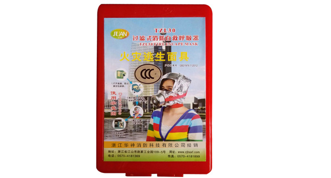 配備于賓館,飯店、辦公樓、商場(chǎng)、學(xué)校、幼兒園、醫(yī)院、影劇院、餐廳、公寓樓、住宅樓等場(chǎng)所,為突發(fā)火災(zāi)時(shí)的逃生裝備。頭罩是由阻燃隔熱材料制成,眼窗為弧成結(jié)構(gòu)視野更廣闊,口鼻罩曲面與顏面部吻合嚴(yán)密,漏氣系數(shù)小。頭罩上使用了特殊的反光材料,增強(qiáng)了火場(chǎng)的識(shí)別能力。濾毒罐可有效地防護(hù)由于各種材料燃燒而產(chǎn)生的有毒害氣體和煙氣,特別對(duì)CO(一氧化碳)和HCN(氰氫酸)及煙氯有很好的防護(hù)功能。